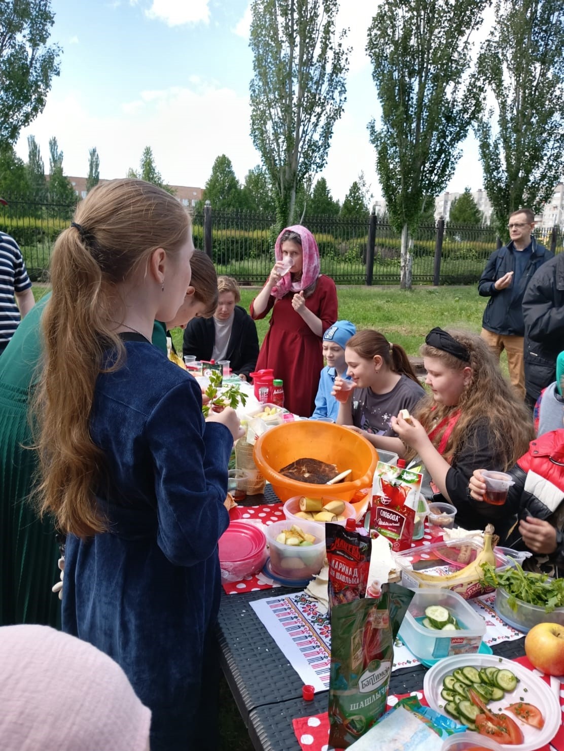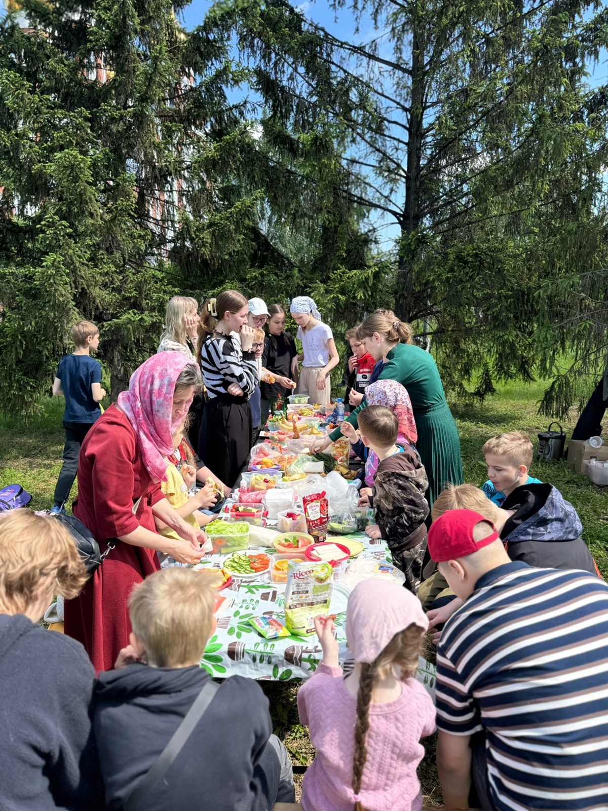 Последняя встреча в этому учебном году воспитанников нашей Воскресной Школы прошла на свежем воздухе: мы организовали пикник! Стол был полон угощений: жаренные сосиски, бутерброды, овощи, фрукты, сладости и чай.